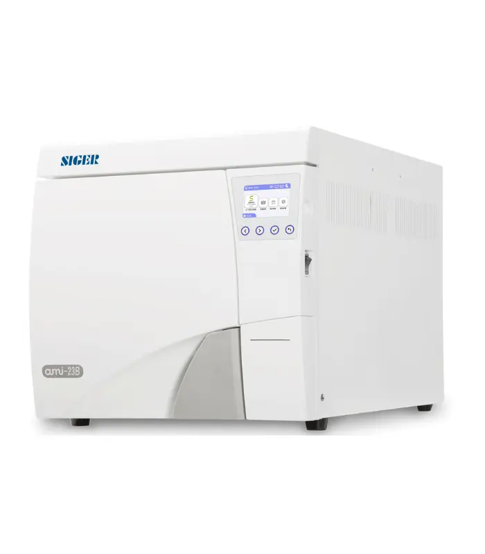 Siger AMI Series autoclaves europeos de clase B. El depósito de agua limpia de 5 litros permite realizar 10 ciclos de esterilización a través de una pantalla intuitiva y el exclusivo sistema de separación aire-agua mejora la eficacia y fiabilidad del sistema.