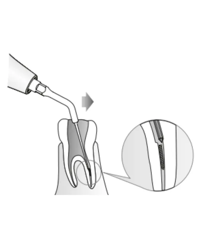 Woodpecker E6 punta ultrasónica fina y flexible, recomendada para extraer restos del conducto radicular profundo.